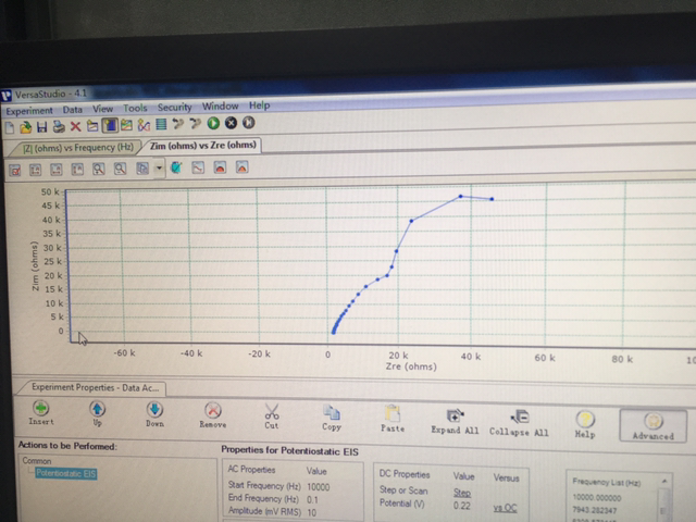 这几天测修饰电极的阻抗,每张图都是先出现一段弧形后,后面又开始出现乱七八糟的线,请问后面这个半圆是啥意思啊,不是应该是一条线吗? 发自小木虫IOS客户端 |