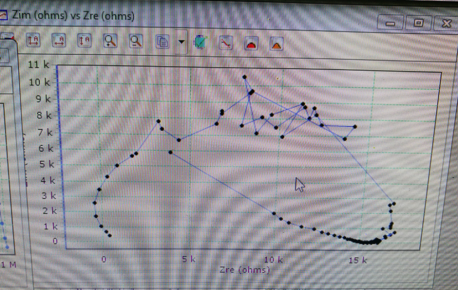 我是做固态电解质的,两面喷金后测阻抗谱,不知道那条弧为什么会回去,而不是一条斜向上的直线,阻抗谱测试从1MHz至0.1Hz,而且中间的点也不是很稳定,我们用的普林斯顿测的 ZPZ(VBP(1_J`%7FF7%V{9R8.png |