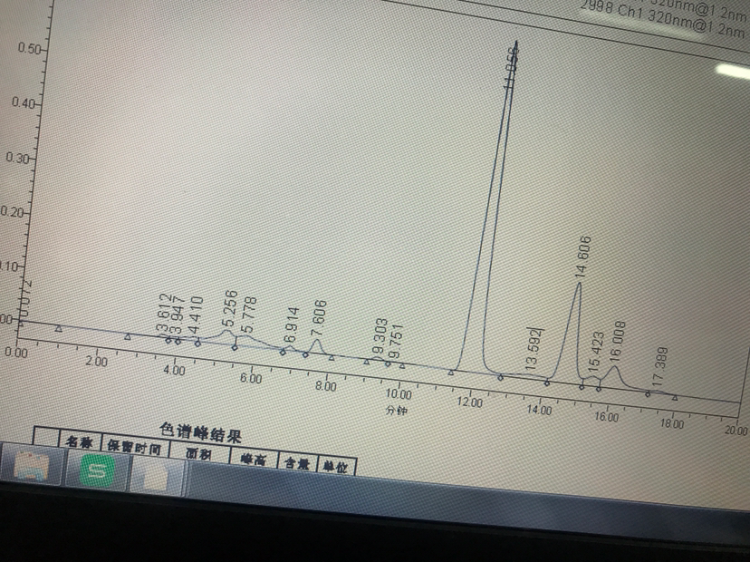 有没有做过柠檬酚酸提取以及含量测定的虫友?我想咨询高效液相来定性定量里面的主要酚酸的方法,参考了部分文献,测出来结果不理想,现在需要做出结果才能进行下一步,所以求助各位虫友。 我用的分离提取方法是80%甲醇超声提取,然后碱解,然后旋蒸色谱甲醇定容,待测!测定条件是4%乙酸:甲醇=80:20,流速1.0,温度40,260和320nm检测。是不是因为我没有氮气保护碱解会影响里面的物质?如图为260和320的结果峰以及260标品峰。 发自小木虫IOS客户端 |