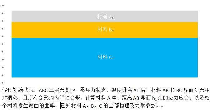 求助:计算三层结构材料的应力应变推导过程。 如图,假设初始状态,ABC三层无变形,零应力状态,温度升高ΔT后,材料AB和BC界面牢固无相对滑移,且所有变形均为弹性变形。计算材料A中,距离AB界面h1处的应力应变,以及整个材料发生弯曲的曲率。已知材料A、B、C的全部物理及力学参数。 捕获.JPG |