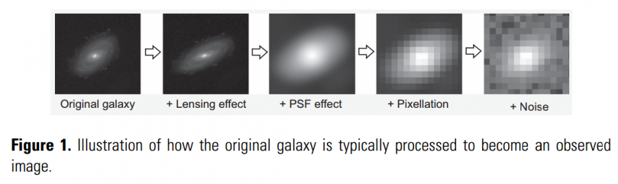 引力透镜效应、点扩散效应、相机系统像素化,以及噪音对星系图像的影响