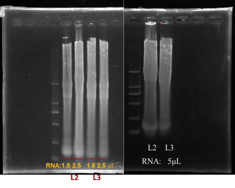 利用CTAB法提取叶片RNA: 试验中用1.5mL的离心管,提取液为1mL!经过1%琼脂糖凝胶电泳检测,发现RNA三条带是有的,但是整个条带呈白色且比较模糊。 这个是为什莫呢? RNA提取 浓度梯度点样.jpg |