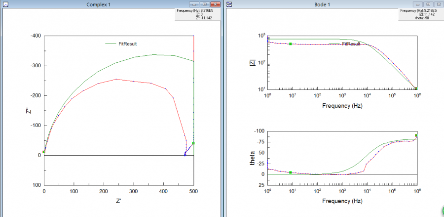 问题一:使用ZView拟合之后的图为图一,等效电路的卡方是13,但拟合之后导出的数据在origin中总是倒着的,如图二,请问是什么情况呢?每组数据的结果都是这样,是等效电路选择错误吗? 问题二:从高频图和z'轴截距如何读出来Rs;Rct可以直接从半圆直径读出吗?如何读? 谢谢! 图1.png 图2.png |