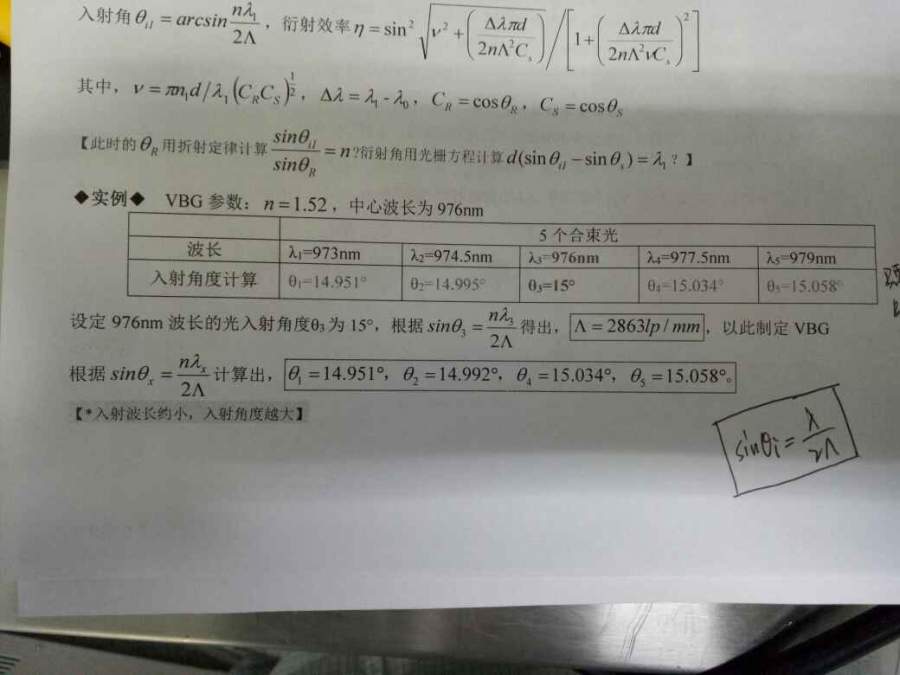 如图中的实例,计算体布拉格光栅的光入射角问题,在入射角等于布拉格角时其衍射效率最大,所以这里只需根据布拉格方程计算布拉格角,但是我计算的布拉格角随着波长的增大而增大,看很多文献都是随波长增大而减小,有点糊涂了。 发自小木虫Android客户端 |