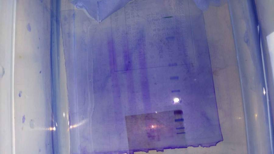 如題,12.5%的分離膠,跑完後以考馬斯藍染色30分後,退染。整個膠片如下圖,樣品?淖⑷氩鄣降撞慷际撬{的,看不出條帶,這是什麼原因呢,請教各位 发自小木虫Android客户端 |