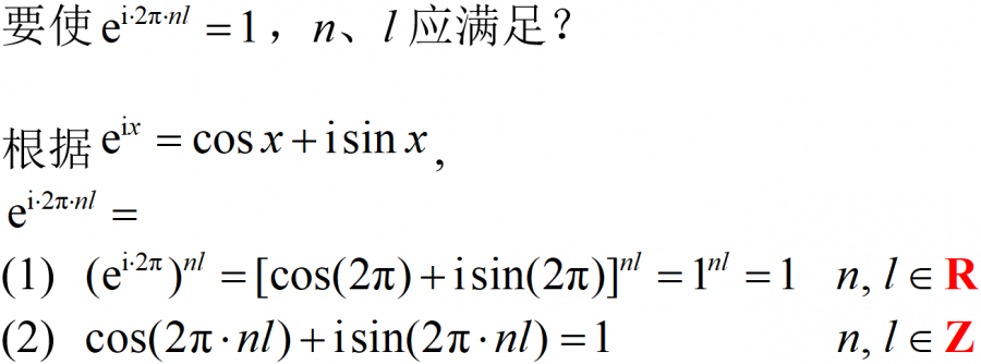 如图所示,要求出当e^(2pi*nl)=1时,n、l应满足的条件。用(1)(2)两种不同的分解方式,得到的结论不同。已知方法(1)有问题,请问是哪一步错了?谢谢!