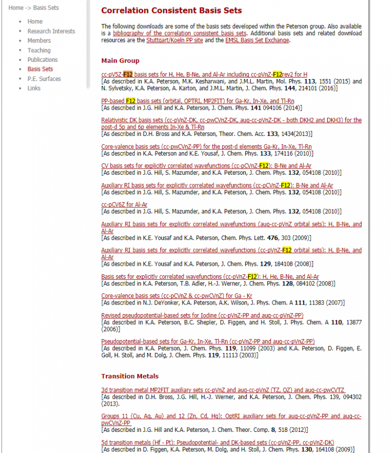 不知道是要什么元素 就直接个网站吧 Peterson组的机组大概都在这里列着 http://tyr0.chem.wsu.edu/~kipeters/basis.html 点开以后找到是哪个元素 然后再是需要的基组 然后再选软件 用法就和EMSL类似了 点开以后大概就是截图里这样 12.png |