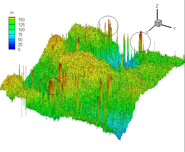 如何用tecplot 360 软件将三维形貌图中的尖锐的线(如图所示)去除?获得与原始形貌图类似的样子,求助大神~谢谢