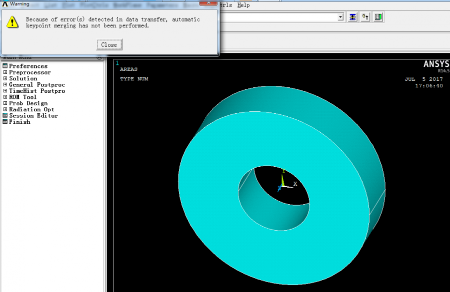 一个长方体板就能显示出来,不知道为什么?本来是想对体划分网格呢,结果是显示不出来,就不能对整个圆环画网格了。。。求大神指教,特别是有圆孔的模型导进来就没成功过,我把模型中的圆孔去掉或者其他的没孔的模型导进来就没事,不知道为啥 2017-07-05_170656.png 2017-07-05_170807.png |