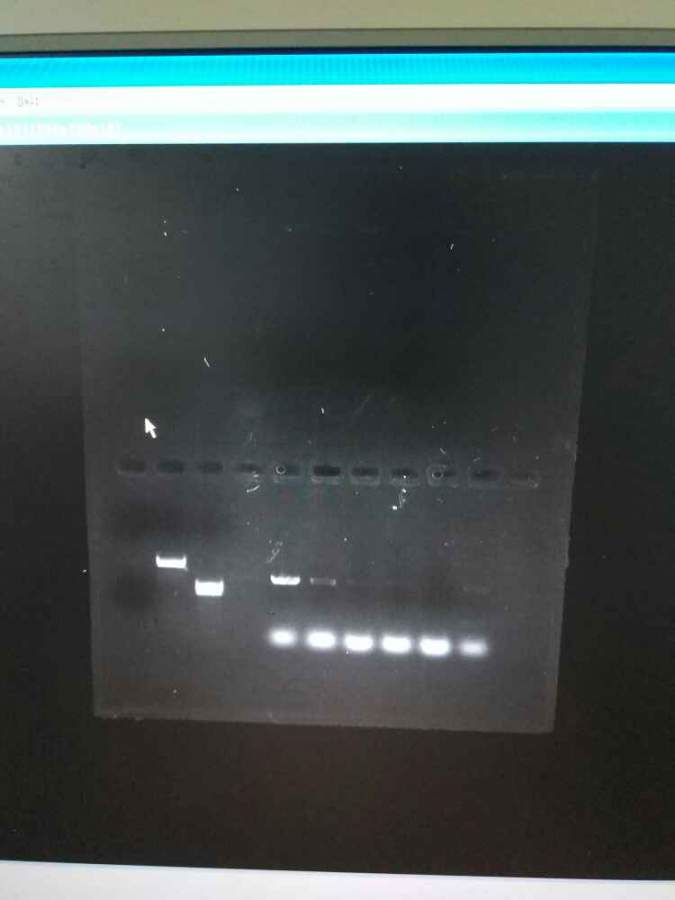 跑胶遇到个奇怪的现象,第一张图为未在紫外照射下的胶图,证明我确实点了样,第二张图为紫外照射成像的胶图,跑胶电压大概80v,电流100mA左右,然而我第一排居然什么都没有,(每排第一个孔为marker,上样量为5ul,孔的大小为10ul,marker用的是dl2503,)按道理说怎么也应该有marker,有劳各位虫友帮忙分析一下 发自小木虫Android客户端 |