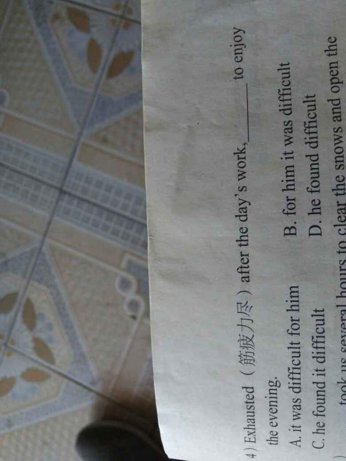 C 前面一句省略主语 是因为他与后一句主语相同 很显然 前面一句的主语是 he 完整句应该是 Because he was exhausted after the day's work 所以后面一句的主语也应该是 he
