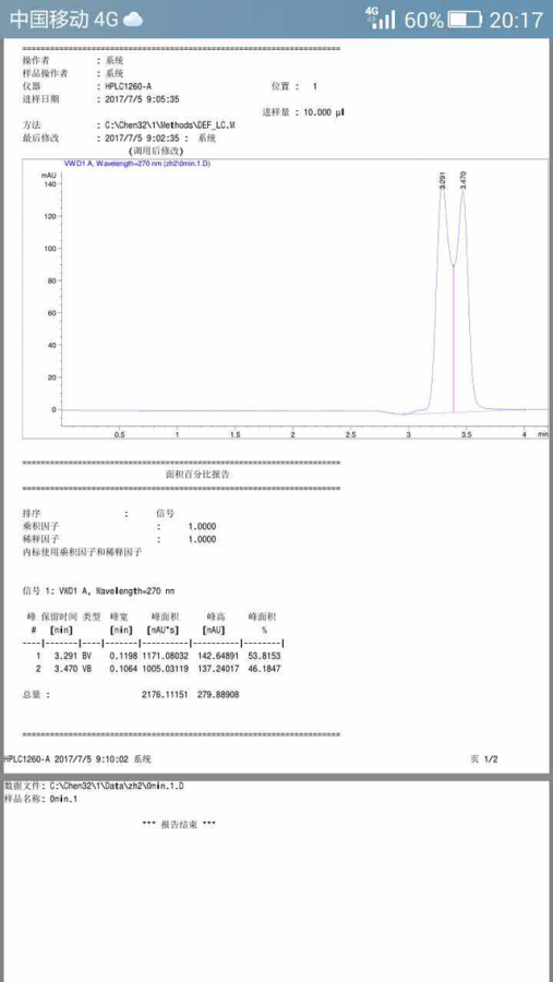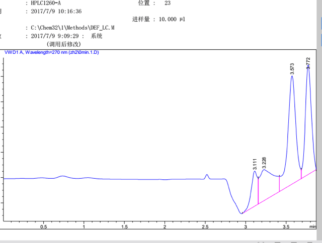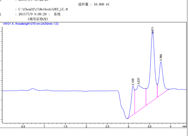 这是肉桂醛催化为肉桂醇的高效液相图,我想问一下图中3.291处是什么中间产物的峰。希望各位大神指点迷津,谢谢。