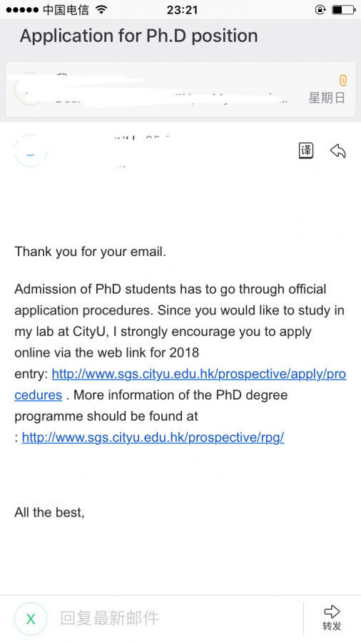 前几天和香港城市大学的某位老师套了下磁,今天收到了回复,因为我来了邮件已读回执,所以应该是他刚点开邮件没多久就回了,请问他这么会是什么意思呢,看不上我客套的回复一下吗? 发自小木虫IOS客户端 |