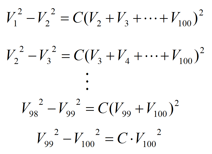 Constant n=99; Parameter v(1:n); Constant v100=0.5; Constant c=0.5; Function For(i=1:n)(v^2-v^2=c*(sum(j=i+1:n+1)(v))^2);