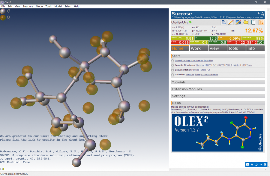 解压就能用。 SHELX 和 Platon 已经配置好, 直接打开 olex2.exe 就可以了。 注意,文件路径不要有中文名,不要放桌面,如果Windows的用户名是中文,桌面路径里也会有中文的。 所以,最好是把文件解压到D盘根目录,就不必担心路径中文的问题。 . |