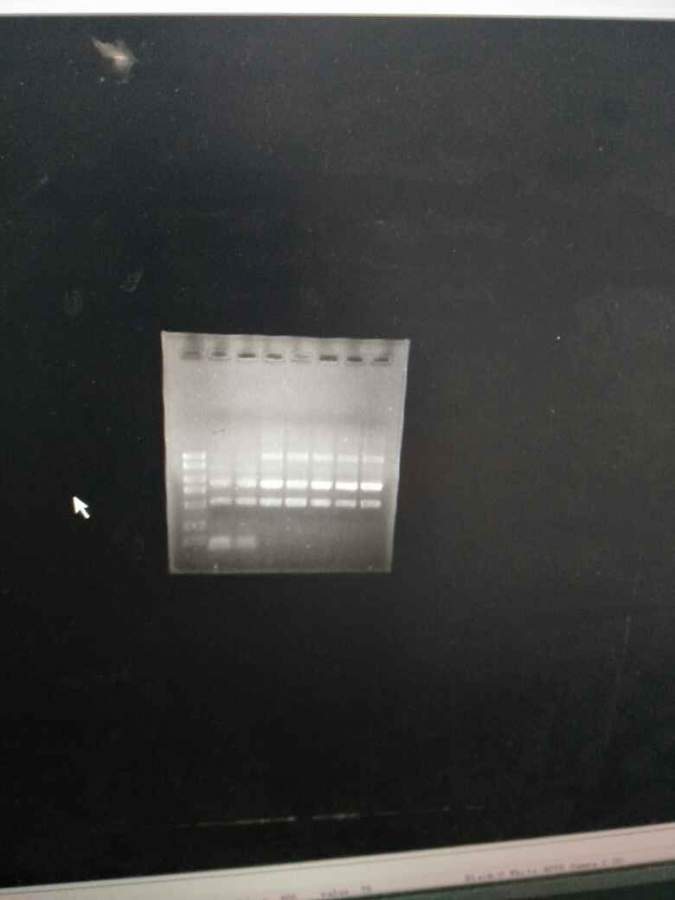 图片上的第一个条带是maker其他的都是目的条带,(七个不同的cDNA为模板)但是前两个条带下面有一条非目的条带是怎么回事?