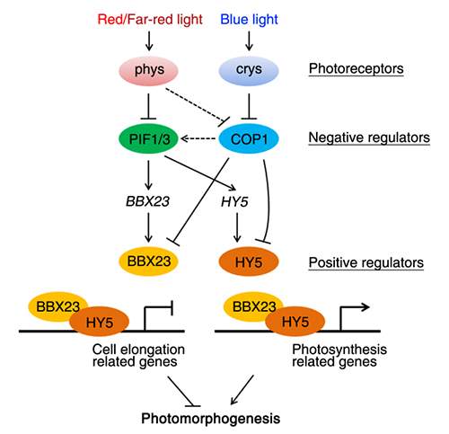 转录调控是生物体内由转录因子和其他调节蛋白协同或拮抗调控基因表达的重要生化机制。光信号是高等植物早期生长发育中光形态建成的决定性因素,其信号通路中光敏色素互作因子PIF为负向调控因子,HY5为正向调控因子。PIF和HY5分别是bHLH型和bZIP型转录因子,在植物生长发育及环境响应中具有广泛的功能,然而二者之间的相互调节仍不甚清楚。 中国科学院植物研究所林荣呈研究组通过对模式植物拟南芥开展研究,发现B-box型蛋白家族第四亚家族成员BBX23能够促进红光、远红光和蓝光条件下的光形态建成。进一步研究显示,在转录水平上,PIF1和PIF3蛋白能够直接结合到HY5和BBX23的启动子并激活它们的表达;在翻译后水平上,BBX23蛋白在黑暗下受到COP1介导的泛素化降解。研究同时表明,BBX23通过与HY5相互作用被招募到下游光响应基因的启动子上,并与HY5协同调控下游基因的表达。研究人员还发现,BBX23的转录受到光的抑制,而它的蛋白在光下积累。 该研究揭示了由PIF1/PIF3、HY5和BBX23组成的转录级联反应调控植物光形态建成的分子机制。结合研究组前期发现PIF1/PIF3与HY5蛋白能相互作用并共同结合到活性氧响应基因的启动子上、进而引发拮抗调控基因表达等研究结果(Chen et al., The Plant Cell, 2013),显示了不同的转录因子可以通过蛋白相互作用或相互转录调控来实现对特定生物学过程的精细调节。 该成果于7月7日在线发表在国际学术期刊《植物生理学》(Plant Physiology)上。林荣呈研究组的博士研究生张鑫裕和助理研究员淮俊玲为论文共同第一作者,林荣呈为通讯作者。研究得到了国家自然科学基金委、农业部和科技部有关项目的资助。 |