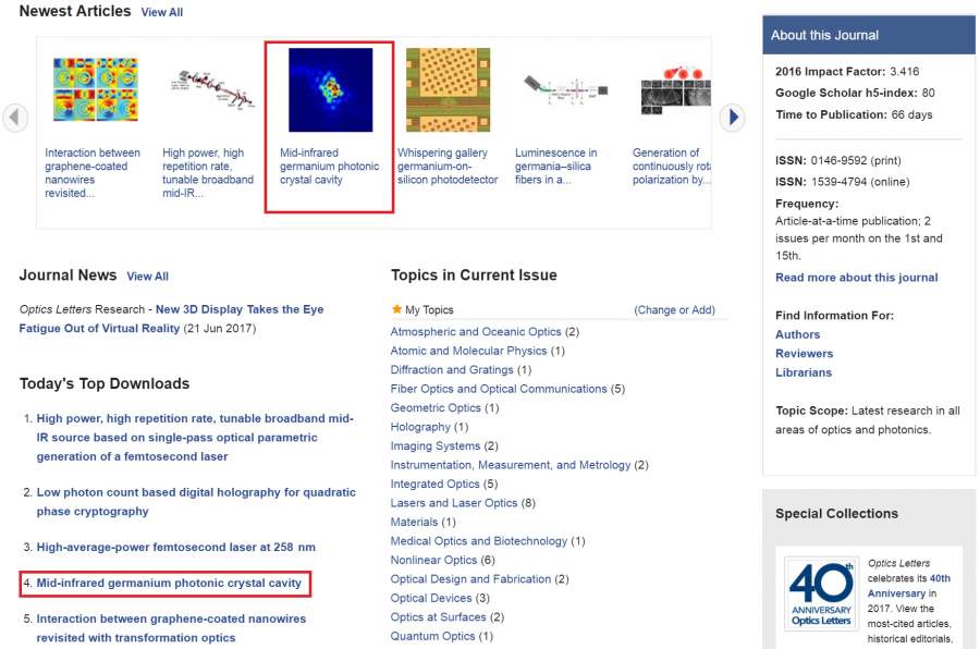 Our paper "Mid-infrared germanium photonic crystal cavity" becomes "Today's Top Downloads" in Optics Letters. https://www.osapublishing.org/ol/home.cfm Top Download 5.jpg |