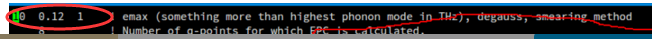 不好意思不怎么登,第一个是最大的声子频率 单位THz,第二个是声子展宽,一般取一个适当值,第三个是smearing method,有0,1,2三个选项,分别对应你算自洽用到的三种smearing 发自小木虫IOS客户端 |