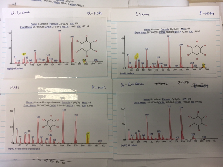 即HCH,一般认为有五种或者六种isomers。我的样品跑了GCMS,然后出现了六个峰,附上我从NIST库里找到的四个isomer标准质谱图,我的样品在m/z 254这边都没啥出峰的,且219这一撮都比181要么这一撮小很多,所以我觉得他们都是阿尔法HCH,这跟我们组之前的结果不一致,所以我想问问大神们我这样靠谱吗...不靠谱的话我应该如何区分它们,还要考虑哪些分子离子峰...或者说不同isomer的出峰先后有没有什么规律...以及...大家有没有其他两种isomer的mass图呀,求..... 发自小木虫IOS客户端 |