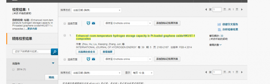 谁能帮查下这篇论文是不是高被引??如能提供详细信息最好啦,谢谢!! Enhanced room-temperature hydrogen storage capacity in Pt-loaded graphene oxide/HKUST-1 composites. Int J Hydrogen Energ. 2014, 39, 2160-2167. |