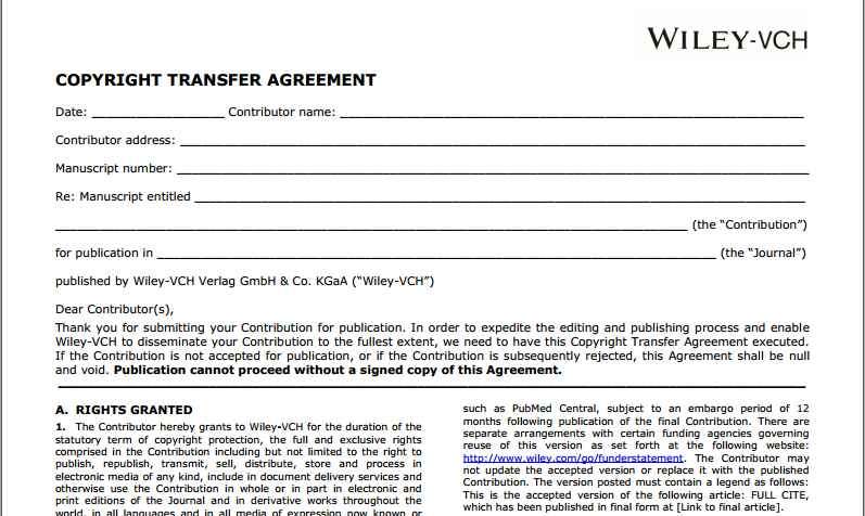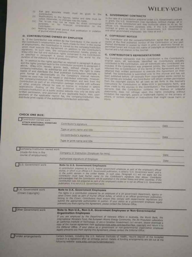 如题 请问万能的虫虫们欧洲化学的版权转让书应该怎么填啊 文章中有两个单位 然后版权转让书的地址只有一行 那我应该是填两份吗?然后是第二页的check in box 这个应该怎么选呢?拜托拜托 谢谢大家 发自小木虫Android客户端 |