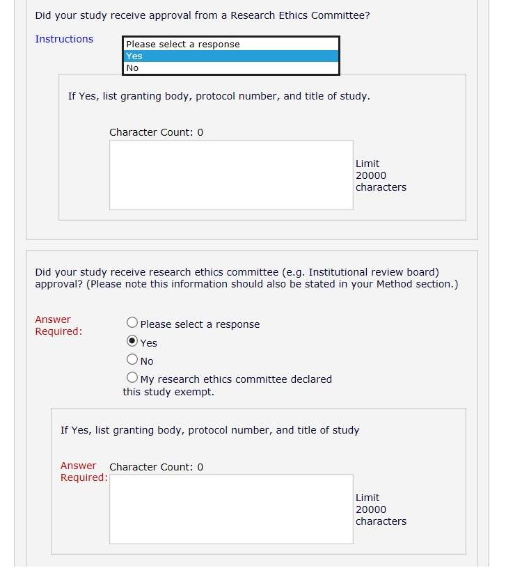 正在准备投稿APA(美国心理学会)的期刊,遇到一个关于投稿时经常会遇到的一个伦理问题,这是投稿时对这个问题的显示界面(具体见附件),在这里想问问大家,界面中所提到的“if yes, list granting body, protocol number, and the title of study",这个该如何得到并填写?恳请知道的朋友指点,非常感谢!![]() research ethics.jpg |
