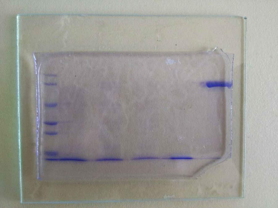 SDS-PAGE时,分离胶和浓缩胶粘连不好是怎么回事,跑完胶,染色和褪色时容易分离,求解决办法? 还有这块胶合理吗,左边是14.4kDa-94kDa的Mark,最右边点的牛血清清蛋白,右2是溶菌酶,左234是我的样。 发自小木虫Android客户端 |