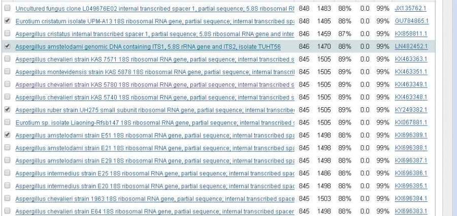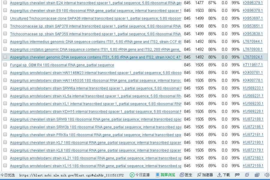 我想确定某菌的属、种,its测序后进行blast比对,比对结果都是Aspergillus属和Eurotium属,我选择同源性比较高的几个序列做发育树,可是建的发育树,目标序列跟所选序列聚不到一起,反而是所选的同源序列之间聚在一起,然后我又不断去挑选其他的序列,发现还是会那样,我该怎么改进呢? 发自小木虫Android客户端 |