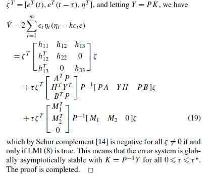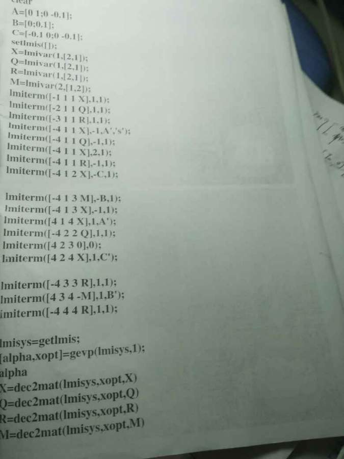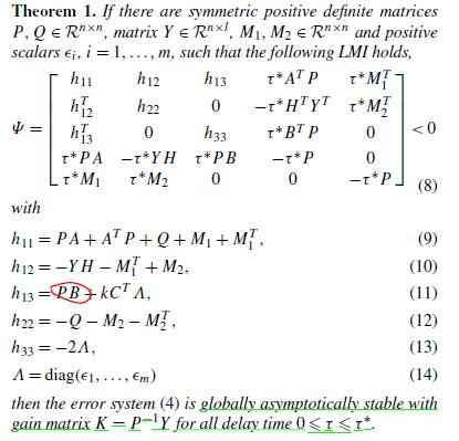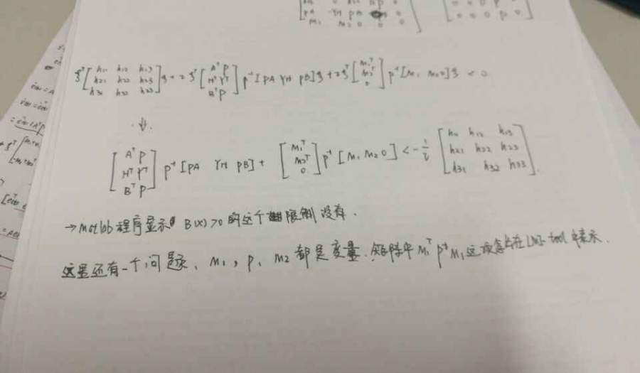 你上面那个例子,我之前看到过,也套用了,但是有一个问题,你的例子的矩阵,它的对角线上都有a,但我那个LMI对角线上的不全是tau,我下面做了两种变换,但都求不出来。我真不知道要怎么办,求您指导啊。第一张图,是根据定理里面的lmi变换出来的,第二张图,是根据证明里面的不等式变换出来的,这里出现了一个问题 :M1,P,M2都是变量,矩阵中M1P^(-1)M2这一项怎么在LMI-tool表示,还有H'Y'P^(-1)PY这里面Y和P也都是变量,这要怎么办。 发自小木虫Android客户端 |