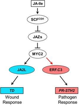 茉莉酸是来源于不饱和脂肪酸的植物免疫激素。其生物合成途径和化学结构与高等动物中的免疫激素前列腺素有极高的类似性。对应于机械伤害、咀嚼式昆虫和死体营养型病原菌的侵害,植物激活茉莉酸信号通路,启动并级联放大茉莉酸介导的转录重编程,从而产生有效的防御反应。但目前对茉莉酸激活植物免疫转录重编程的机理所知甚少。 中国科学院遗传与发育生物学研究所李传友研究组长期以番茄为模式研究茉莉酸调控植物免疫的分子机理。该研究组最近的研究发现,茉莉酸信号通路的核心转录因子MYC2通过正向调控机械损伤相关基因及病程相关基因等与抗病抗虫密切相关的基因的表达实现植物对病虫侵害的有效防御。利用染色质免疫共沉淀--测序(ChIP-Seq)与全基因组表达谱--测序(RNA-Seq)相结合的手段,李传友研究组在番茄全基因组范围内确定了一系列MYC2直接结合的靶标基因。令人感兴趣的是,李传友研究组发现MYC2直接结合的靶标基因中富含转录因子基因,表明MYC2是茉莉酸信号通路中高层级的转录调控元件。进一步研究表明MYC2与其直接结合的次级转录因子形成一系列的转录级联调控模块(transcription module)。这些转录级联调控模块在免疫转录重编程的激活和级联放大中起至关重要的作用。这一发现对于人们深入理解茉莉酸调控植物抗病抗虫的机理具有重要意义,并为番茄抗病抗虫分子育种提供了重要的理论指导。 该研究结果已于2017年7月21日在线发表于The Plant Cell (DOI:10.1105/tpc.16.00953)。李传友研究组的杜敏敏博士和山东农业大学的赵久海教授是该论文的共同第一作者。该研究得到中国科学院战略性先导专项、科技部、农业部和国家自然科学基金委的资助。 The hormone jasmonate (JA), which functions in plant immunity, regulates resistance to pathogen infection and insect attack through triggering genome-wide transcriptional reprogramming in plants. We show that the basic helix-loop-helix transcription factor (TF) MYC2 in tomato (Solanum lycopersicum) acts downstream of the JA receptor to orchestrate JA-mediated activation of both the wounding and pathogen responses. Using chromatin immunoprecipitation sequencing (ChIP-seq) coupled with RNA sequencing (RNA-seq) assays, we identified 655 MYC2-targeted JA-responsive genes. These genes are highly enriched in Gene Ontology categories related to TFs and the early response to JA, indicating that MYC2 functions at a high hierarchical level to regulate JA-mediated gene transcription. We also identified a group of MYC2-targeted TFs (MTFs) that may directly regulate the JA-induced transcription of late defense genes. Our findings suggest that MYC2 and its downstream MTFs form a hierarchical transcriptional cascade during JA-mediated plant immunity that initiates and amplifies transcriptional output. As proof of concept, we showed that during plant resistance to the necrotrophic pathogen Botrytis cinerea, MYC2 and the MTF JA2-Like (JA2L) form a transcription module that preferentially regulates wounding-responsive genes, whereas MYC2 and the MTF ETHYLENE RESPONSE FACTOR.C3 (ERF.C3) form a transcription module that preferentially regulates pathogen-responsive genes. |