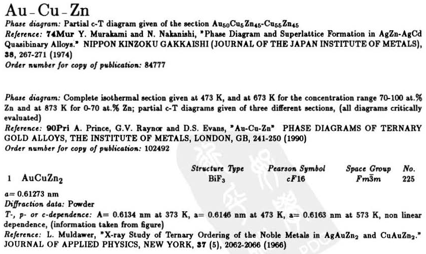 求助Au-Cu-Zn三元相图,谢谢 Handbook of ternary alloy phase diagrams. Vol. 4 : Al-Ga-Ge - Au-Te-Tl. |