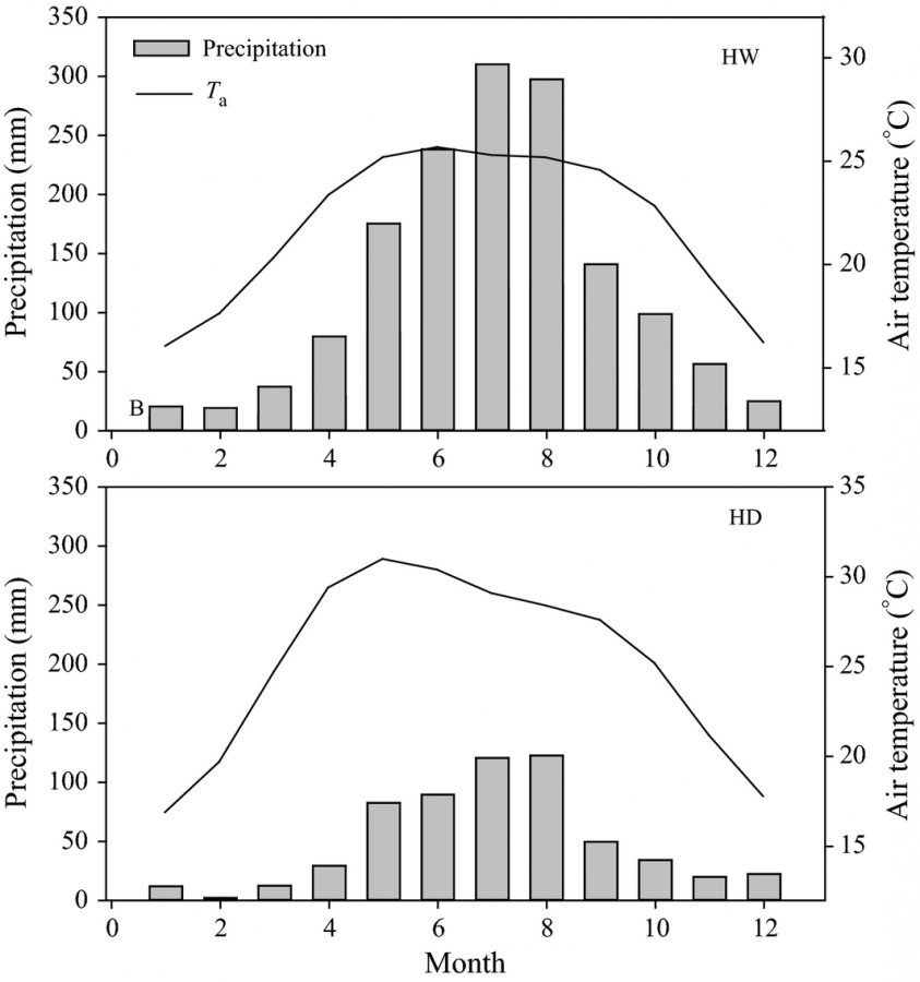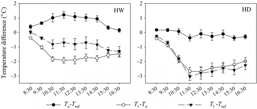 Monthly total precipitation and average air temperature in the hot wet habitat (HW) and the hot dry habitat (HD) 该研究成果以Stronger cooling effects of transpiration and leaf physical traits of the plants from a hot dry habitat than from a hot wet habitat 为题,发表在Functional Ecology 杂志上。该研究得到了国家自然科学基金(31200307),云南省应用基础研究项目(2013FB078)以及中科院国际人才计划(2016VBA036)的支持。研究过程中得到元江生态站和版纳生态站的大力支持。 随着全球变暖,植物的热适应成为人们关注的热点之一。叶片温度直接决定了植物所处的微环境。人们通常用气温来判断植物的生长环境,然而即使在相同气温下,植物的叶片温度也可能有很大差异,因此研究植物叶片温度的差异及其机制,有助于准确了解植物所处的微环境,深入认识植物的热适应。此前对叶片温度影响因子的研究大多针对某个性状或某几个性状,然而除了蒸腾以外,很多物理性状,如叶片大小、形状、物性、解剖结构以及光学特性等都会对叶片温度产生影响。某一个或几个叶片性状并不能完全决定叶片的温度,不能全面认识叶片温度的调控机制。 Diurnal temperature differences compared with the reference leaves for the plants from hot wet habitat (HW, n = 18) and hot dry habitat (HD, n = 20). 中国科学院西双版纳热带植物园树木年轮与环境变化研究组副研究员林华及其同事以种植在相同环境下的20种元江干热河谷冠层优势植物和18种热带雨林冠层优势植物为研究对象,利用红外热像仪对植物叶片的温度进行研究,并摸索出了“三温法”(叶片温度-无蒸腾叶片温度-参考叶片温度),成功对叶片物理温度效应和蒸腾温度效应进行了原位测量和分离。研究发现,相同环境下,元江干热河谷地区的植物叶片温度普遍低于热带雨林植物;干热河谷地区的植物叶片较小,反射率较高,吸收率较小,总的物理降温效果优于热带雨林植物。水分缺乏的时候,物理降温在一定程度上缓解了高温对叶片的胁迫;另一方面,干热河谷地区的植物蒸腾速率普遍高于热带雨林植物,蒸腾降温较热带雨林植物高,在叶片解剖结构上也表现出更大的叶脉密度和气孔面积指数(气孔长度×气孔数量)。即使在雨季,元江干热河谷地区的温度也可能超过40°C,高效的蒸腾降温保证了光合作用的顺利进行,使这些植物以更高的光合速率尽可能多地合成干物质以弥补生长季较短的不足。 相同环境下,干热河谷植物(HD)和热带雨林植物(HW)的叶片红外温度图像 该研究揭示了不同来源地植物叶片对高温环境的适应策略,体现了气体交换与植物叶片热力调节的协同进化,加深了人们对植物热适应的认识。 |