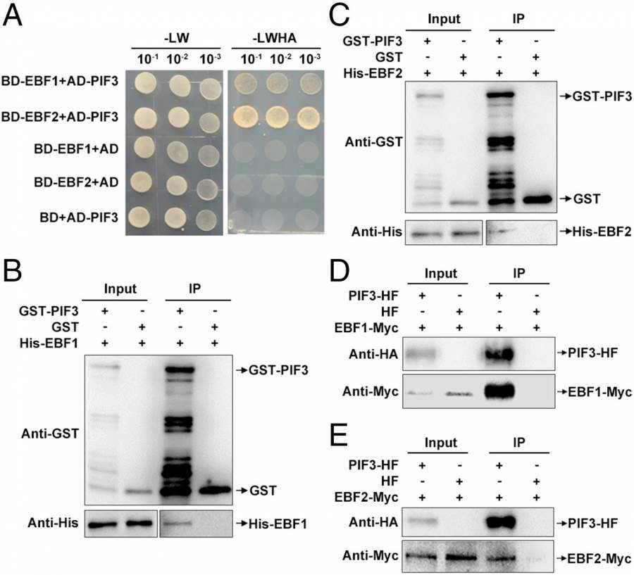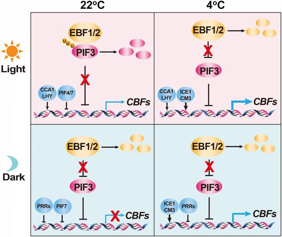 在低温和黑暗条件下,泛素连接酶EBF1/EBF2发生降解,使PIF3蛋白积累并抑制CBF基因的表达 近日,中国农业大学植物生理生化国家重点实验室杨淑华课题组在最新一期的国际著名刊物Proceedings of the National Academy of Sciences (PNAS)发表了标题为“PIF3 is a negative regulator of the CBF pathway and freezing tolerance in Arabidopsis”的研究论文。该研究发现光信号转导通路关键转录因子PIF3参与负调控植物抗冻性,同时E3泛素化连接酶EBF1/EBF2参与了低温介导的PIF3蛋白稳定性调控,揭示了光信号参与负调控植物抗冻性的分子机理。 植物生长发育需要适宜的环境温度条件。低温是影响植物生长发育及作物产量最主要的逆境胁迫之一,因此植物进化出了冷驯化(cold acclimation)能力来应对低温逆境胁迫。杨淑华课题组一直致力于植物低温胁迫的信号转导通路的研究。该课题组相继发现蛋白激酶OST1能被低温激活,从而正调控ICE1–CBF低温关键信号通路和植物抗冻性(Dev Cell, 2015);CBF信号通路同时会被CRPK1–14-3-3等负调控信号途径所抑制(Mol Cell, 2017),以此精细调控植物的生长发育与抗逆性之间的平衡。 PIF3 interacts with EBF1/2 in vitro and in vivo 在自然条件下,植物需要整合光和温度信号等环境因子来适应环境的变化,但是光信号在植物冷响应过程中的作用目前尚不清楚。该团队在筛选植物抗冻突变体的过程中,鉴定到光信号关键转录因子PIF3负调控植物抗冻性。pif3突变体表现出抗冻表型,而PIF3过表达转基因植株则具有明显的冻敏感表型。进一步研究发现,PIF3能够直接结合在转录因子CBFs的启动子区,抑制CBFs及其下游冷响应基因表达。此外,该研究还发现低温可以增强PIF3蛋白的稳定性。此前的研究表明,在常温光照条件下PIF3蛋白会被LRBs E3连接酶识别并降解。该研究发现了两个新的E3泛素连接酶EBF1和EBF2能够与PIF3发生相互作用,并使其通过26S蛋白酶体途径降解。低温及黑暗条件可以促进EBFs蛋白降解,从而使PIF3蛋白更加稳定。遗传证据进一步表明EBF1和EBF2是植物冷响应途径的正调控因子,ebf1和ebf2单突变体在冷驯化前后均表现出冻敏感表型,而pif3突变体可以回复ebf1突变体表型。该研究通过揭示PIF3在低温响应过程中的新功能和调控机制,阐明了光和温度在植物冷驯化过程的关系密不可分,共同平衡着植物的抗冻性和生长发育过程。 PHYTOCHROME-INTERACTING FACTORS (PIFs) are central integrators of plants’ responses to various environmental signals. In this study, we show that PIF3 acts as a negative regulator of plant cold acclimation by directly repressing the expression of CBF genes, whereas its protein stability is negatively regulated by two F-box proteins, EBF1 and EBF2, via the 26S proteasome pathway. Moreover, EBF1 and EBF2 are degraded under cold stress, which enhances the stability of PIF3 protein. Collectively, our study establishes an important regulatory paradigm for PIF3 in preventing runaway expression of the CBF genes at low temperature, which allows plants to adapt to and withstand harsh environments. PIF3 negatively regulates freezing tolerance in Arabidopsis Light and temperature are major environmental factors that coordinately control plant growth and survival. However, how plants integrate light and temperature signals to better adapt to environmental stresses is poorly understood. PHYTOCHROME-INTERACTING FACTOR 3 (PIF3), a key transcription factor repressing photomorphogenesis, has been shown to play a pivotal role in mediating plants’ responses to various environmental signals. In this study, we found that PIF3 functions as a negative regulator of Arabidopsis freezing tolerance by directly binding to the promoters of C-REPEAT BINDING FACTOR (CBF) genes to down-regulate their expression. In addition, two F-box proteins, EIN3-BINDING F-BOX 1 (EBF1) and EBF2, directly target PIF3 for 26S proteasome-mediated degradation. Consistently, ebf1 and ebf2 mutants were more sensitive to freezing than were the wild type, and the pif3 mutation suppressed the freezing-sensitive phenotype of ebf1. Furthermore, cold treatment promoted the degradation of EBF1 and EBF2, leading to increased stability of the PIF3 protein and reduced expression of the CBF genes. Together, our study uncovers an important role of PIF3 in Arabidopsis freezing tolerance by negatively regulating the expression of genes in the CBF pathway. |