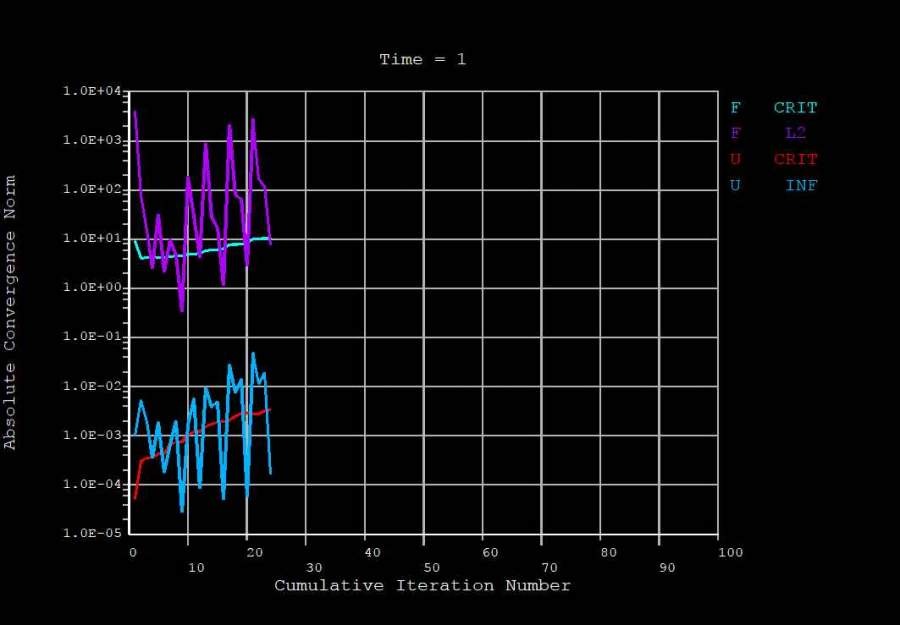 你的 F 是 L2;U 是 INF。 L2 和 INF 都是不同的收敛准则,在帮助文件中,有关 CNVTOL 命令的说明中有个简单介绍: 2 — L2 norm (check SRSS value) (default). 1 — L1 norm (check absolute value sum). 0 — Infinite norm (check each DOF separately). 即 INF |