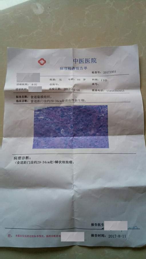 这是我家二叔,最近一段时间,经常吃饭噎住,吞不下去,等很长时间才能吞下去,平常感觉十分难受,一直拖着, 不去看医生,最近没有办法了,才在家人要求下去检查,今天下午检查报告显示“食道距门齿29-34cm处”鳞状细胞癌, 平时一直喜欢喝酒,怎么劝解不要喝酒都没有用, 家人看到这个报告,十分急,不能接受,询问一下,这个做手术能不能好,家人十分害怕癌细胞扩散了, 附上检测报告,懂医学的虫子帮忙看看! 写得比较乱,麻烦大家帮忙看看这个检测报告!谢谢! IMG_4332.JPG@carci |