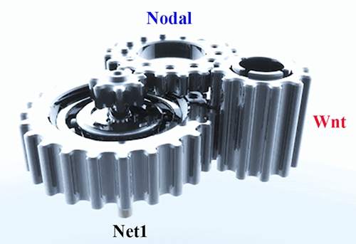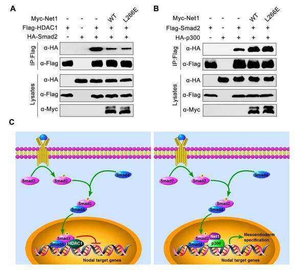 Net1分别作为鸟核苷酸交换因子和适配体蛋白,整合了Wnt/β-catenin和Nodal/Smad2信号通路 Nodal是TGF-β超家族成员之一,在脊椎动物胚胎中内胚层诱导、神经图式形成、原肠运动、内脏器官左右不对称等发育过程中具有广泛而重要的作用。中国科学院动物研究所王强研究员领导的研究组主要从事TGF-β家族跨膜信号转导通路在胚胎早期发育及组织器官形成中的调控机制研究。他们在原肠期斑马鱼胚胎中系统鉴定了Nodal/Smad2信号的靶基因,其中包括鸟核苷酸交换因子Net1(J Biol Chem. 2011)。Net1蛋白主要位于细胞核,少量位于细胞质,在多种肿瘤细胞中高表达,通过激活小G蛋白RhoA促进肿瘤细胞侵袭和转移。王强研究组的前期研究发现,斑马鱼的net1是MBT前后最早表达的合子基因之一,特异表达于预定背部组织中心。Net1通过激活RhoA家族的G蛋白,干扰PAK1二聚体的形成,激活PAK1激酶活性,从而磷酸化β-catenin 675位丝氨酸,抑制β-catenin与组蛋白去乙酰化酶HDAC结合,促进Wnt靶基因转录,在胚胎背部轴建立过程中发挥重要作用(Cell Research. 2017)。然而,目前对于细胞核内Net1的功能还所知甚少。 Net1 promotes Nodal signal downstream of or parallel to Smad2 TGF-β/Nodal靶基因可以反馈调控信号通路。例如TGF-β信号通路激活2小时,可以显著增加SnoN 的转录;另一方面,SnoN可以抑制Smad2及Smad3的磷酸化及Smad复合体与DNA结合,是TGF-β信号通路的抑制因子。因此,做为TGF-β/Nodal信号通路的靶基因,Net1可能参与了TGF-β信号通路的调控。王强研究组的研究发现,在胚胎及哺乳动物细胞中敲低net1后,抑制了TGF-β/Nodal信号活性,致使中内胚层及其衍生器官的形成产生严重缺陷。进一步的研究表明,与Net1鸟核苷酸交换因子活性无关,定位于细胞核内的Net1通过与Smad2结合,增强Smad2招募组蛋白乙酰化酶p300的能力,促进胚胎中内胚层的形成。因此,在脊椎动物早期胚胎发育过程中,Net1分别做为鸟核苷酸交换因子和适配体蛋白,整合了Wnt/β-catenin和Nodal/Smad2两种极为重要的信号通路,在体轴建立和中内胚层形成过程中扮演了关键的角色。鉴于TGF-β、Wnt及Net1在肿瘤细胞增殖、侵袭和转移中的重要作用,这项研究结果还为了解相关肿瘤发生发展机制及肿瘤诊治方面开拓了新的思路。 Net1 increases the affinity of Smad2 for p300 Net1 is a well-characterized oncoprotein with RhoA-specific GEF activity. Oncogenic Net1 lacking the first 145 amino acids is present in the cytosol and contributes to the efficient activation of RhoA and the formation of actin stress fibers in a number of tumor cell types. Meanwhile, wild-type Net1 is predominantly localized in the nucleus at steady state due to its N-terminal nuclear localization sequences, where the function of nuclear Net1 has not been fully determined. Here, we find that zebrafish net1 is expressed specifically in mesendoderm precursors during gastrulation. Endogenous Net1 is located in the nucleus during early embryonic development. Gain- and loss-of-function experiments in zebrafish embryos and mammalian cells demonstrate that, regardless of its GEF activity, nuclear Net1 is critical for zebrafish mesendoderm formation and Nodal/Smad2 signal transduction. Detailed analyses of protein interactions reveal that Net1 associates with Smad2 in the nucleus in a GEF-independent manner, and then promotes Smad2 activation by enhancing recruitment of p300 to the transcriptional complex. These findings describe a novel genetic mechanism by which nuclear Net1 facilitates Smad2 transcriptional activity to guide mesendoderm development. |