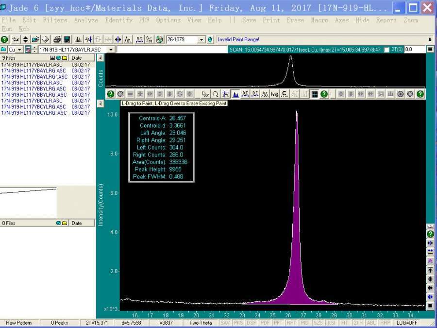 请问Jade6里边如何找出X射线衍射峰的半高宽中心处角度?怎么实现呢?只看到半高宽的数据,但是没有半高宽所在处的角度信息,半高宽中心处对应的角度不知道怎么看。 bw133h798382_1502445384_670.jpg |
