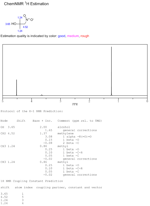 C4H9NO3核磁共振氢谱显示3.8(单峰 2h),2.6(单峰 1h),1.6(单峰,6h) 我认为可以是2-甲基-2-硝基丙醇或者是2-甲基基-2-羟基硝基苯。我想确定一下这两个化合物具体出峰有什么区别。 还有大佬们有没有推荐的可以直接查化合物谱图的网站呀 发自小木虫Android客户端 |