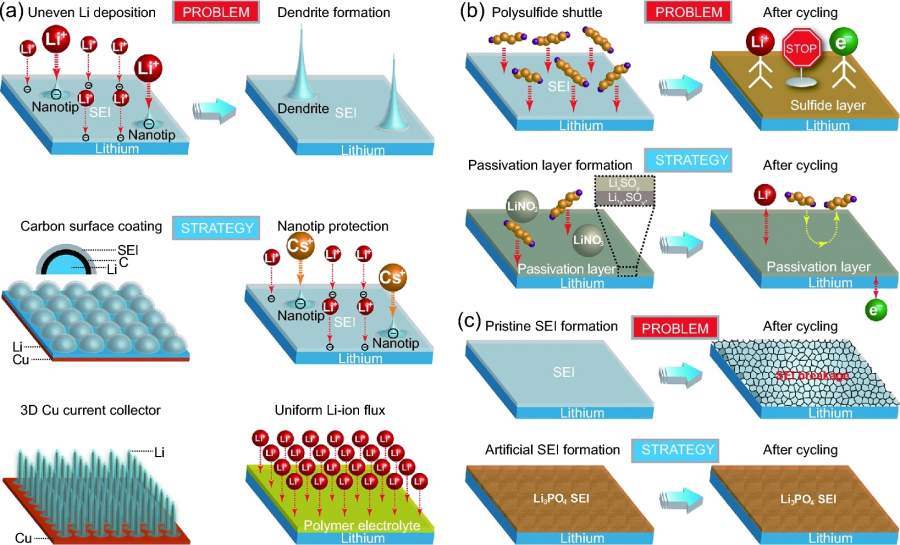 综述题目:Progress of rechargeable lithium metal batteries based on conversion reactions 文章链接(免费获取,欢迎点击!):https://doi.org/10.1093/nsr/nww078 Abstract: In this review, we focus on the conversion reaction in newly raised rechargeable lithium batteries instanced by lithium–sulfur and lithium–oxygen batteries. A comprehensive discussion is made on the fundamental electrochemistry and recent advancements in key components of both types of the batteries. The critical problems in the Li–S and Li–O2 conversion electrochemistry are addressed along with the corresponding improvement strategies, for the purpose of shedding light on the rational design of batteries to reach optimal performance. 【文章图】提高锂硫电池cyclo-s8阴极电化学性能的策略概述。 【文章图】改善锂硫电池锂阳极电化学性能的策略概述:(a)防止枝晶形成的策略,(b)防止钝化硫化物层形成的策略,(c)防止SEI破裂的策略。 |