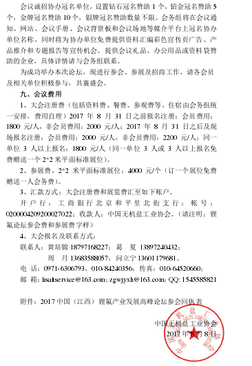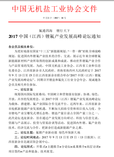 尊敬的专家、领导您好, 中国无机盐工业协会联合江西省经信委、青海省海西州政府、江西省新余市政府,定于9月13-9月15日在江西新余召开2017 中国(江西)锂氟产业发展高峰论坛。论坛分为:主论坛、锂资源开发与利用分论坛、锂电池材料分论坛、锂电池及新能源汽车分论坛、氟化工技术与装备分论坛,同时举办宣传展览。 现诚邀各单位参加、共襄盛会! 参会联系电话:13897240432葛夏 电话:0971-6306793 参展联系电话:18297212652刘伟朝 电话:0971-6306793 论文征文邮箱:744636392@qq.com 中国无机盐工业协会 2017年8月15日 3.png 2.png 1.png |