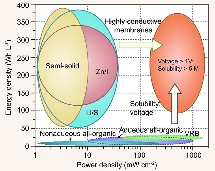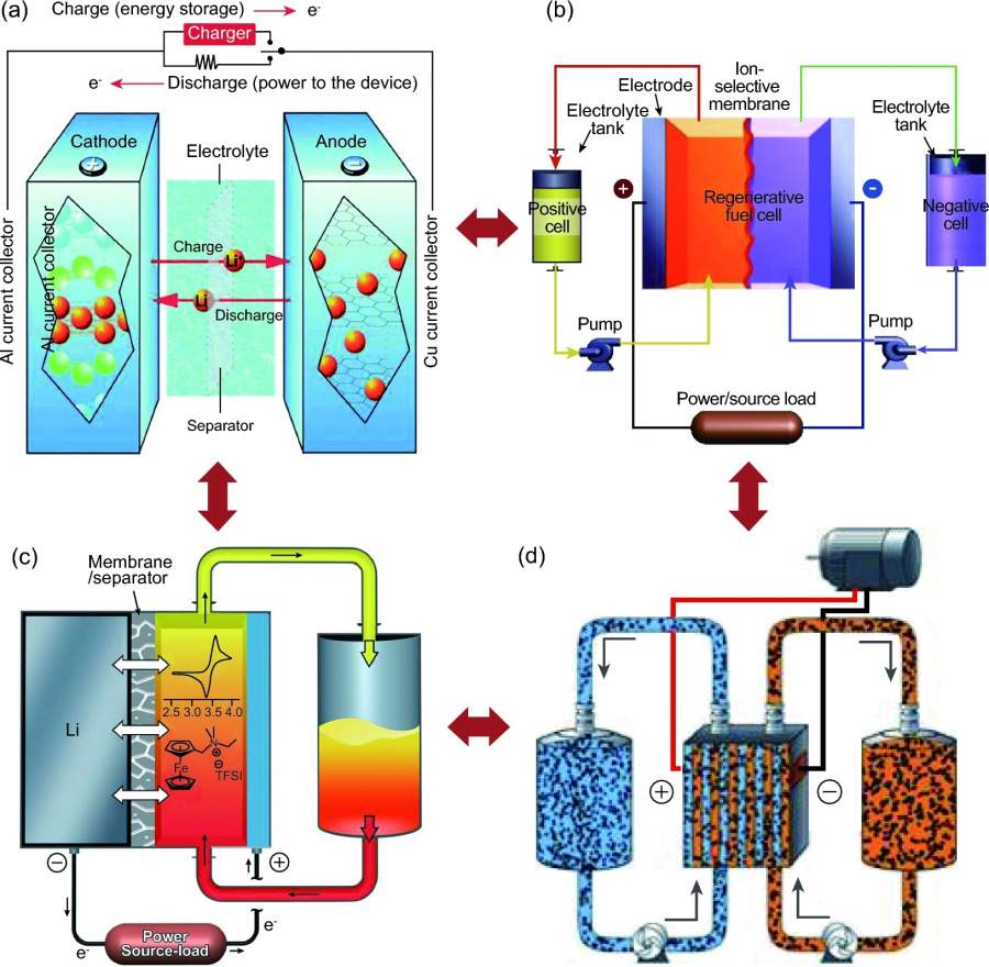 文章题目:Progress and directions in low-cost redox-flow batteries for large-scale energy storage 文章链接(免费获取,欢迎点击下载!):https://doi.org/10.1093/nsr/nww098 摘要: 与锂离子电池相比,氧化还原液流电池(RFB)在长时间、大规模的储能应用中广受关注。本综述深入探讨了能源存储中最重要的挑战之一:如何降低RFB的成本。解决这一问题最直接有效的手段,是开发低成本材料和高溶解性氧化还原化学反应体系。高水溶性无机氧化还原对对于开发高能量密度和低成本储能技术具有重要意义。此外,合理设计有机氧化还原分子并优化其在液态和非液态体系中的性质也有很大的潜力。许多新的概念已经开始模糊传统电池和RFB之间的界限,在识别/开发膜和分离器,以及控制电极表面副反应等方面,也需要突破。 Compared to lithium-ion batteries, redox-flow batteries have attracted widespread attention for long-duration, large-scale energy-storage applications. This review focuses on current and future directions to address one of the most significant challenges in energy storage: reducing the cost of redox-flow battery systems. A high priority is developing aqueous systems with low-cost materials and high-solubility redox chemistries. Highly water-soluble inorganic redox couples are important for developing technologies that can provide high energy densities and low-cost storage. There is also great potential to rationally design organic redox molecules and fine-tune their properties for both aqueous and non-aqueous systems. While many new concepts begin to blur the boundary between traditional batteries and redox-flow batteries, breakthroughs in identifying/developing membranes and separators and in controlling side reactions on electrode surfaces also are needed. 【文章图】不同电极材料电池的结构示意图 【文章图】文中探讨的各种RFB的能量密度-功率密度范围 |