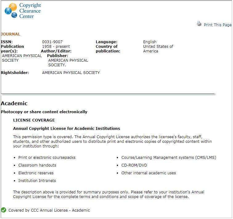在写一篇综述,需要引用别人文章中的图片,大部分是nature、science、PRL之类。在https://www.copyright.com上发现有"pay per use options"和"annual liencse options"两个选择。前者中的子选项基本都是收费的,有的还挺贵,且过程繁琐,后者(见贴图)貌似不收费,但是不太明白什么意思。请有经验的虫友帮忙回答下,我该选哪个?如果选"pay per use options",该选哪个子选项?如果选"annual liencse options",是不是默认academic的review文章中引用图不收费,那我选择后下一步该怎么做?是不是把贴出的截图打印或保存一下就行了?谢谢! 注:"annual liencse options"的解释是You're covered if you are a faculty member or staff of an academic institution that has purchased an Annual Copyright License from Copyright Clearance Center. This permission type is covered by your license。请问国内有这样的单位吗? 回答到点上,直接送200金币,决不食言! 截图.jpg [ Last edited by gqy_cdsqbyl on 2017-8-19 at 17:46 ] |