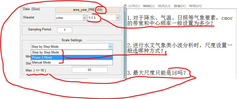 最近用cmor小波分析气象要素,有几个问题求大神指教,(以下问题经baidu没得到理想答案): 1.对于降水、气温、日照等气象要素,cmor的带宽和中心频率一般设置为多少? 2.进行水文气象类小波分析时,尺度设置一般选哪种方式? 3.序列长为55时,最大尺度只能是16吗?有点文献里最大尺度能很接近序列长度,是怎么设置的呢? cmor疑问.PNG |