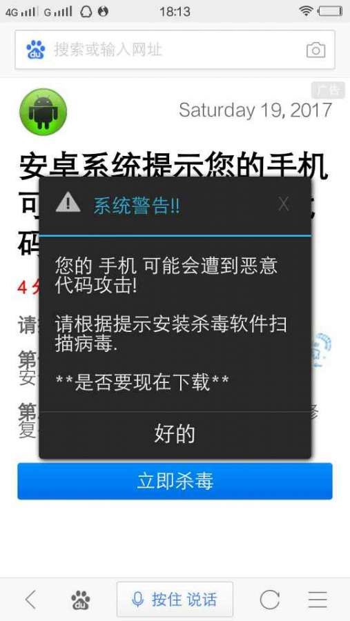 安卓都有个开关,是否允许安装未知来源的app,记得要禁止。禁止以后如果你不是从手机的商店下载的app安装都会有提示,不要安装就行。像这样的提示一定是病毒广告。就算你点击下载了,只要前面那个选项禁止了,也不会自动安装。 发自小木虫Android客户端 |