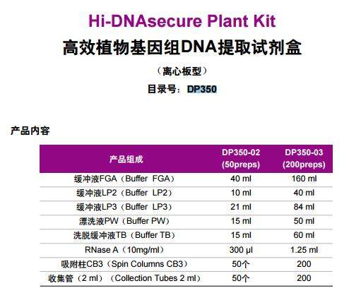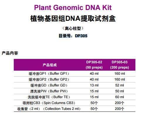 天根的植物基因组DNA提取试剂盒(离心柱型)目录号:DP305和高效植物基因组DNA提取试剂盒(离心板型)DP350有什么区别呢?请教各位,我是要提取蔷薇科杏属的,这两种哪个更好呢。下面图片有它们详细的成分。谢谢各位了。 QQ图片1.jpg QQ图片2.jpg@biostar2009 |