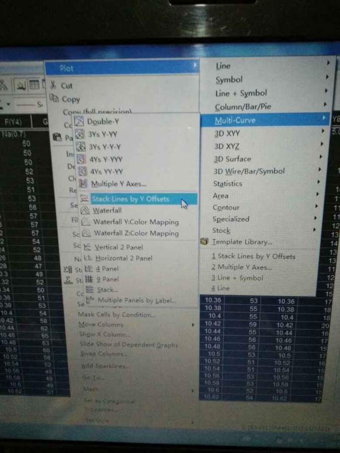 选中需要画图的数据,然后点击鼠标右键,有个plot按钮弹出下拉菜单,再选择Multi-Curve按钮,进而弹出一个新的菜单,再选择Stack Lines by Y Offsets就做出来大致的图了,最后再适当调整图就可以了 发自小木虫Android客户端 |