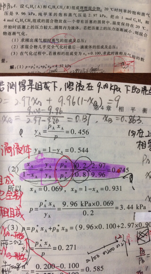 求大神指教。第二小问。我知道最后一滴液体的yA等于开始时的xA,yB等于开始时的xB,,但是我不明白求最后一滴液体的组成怎么想到要这么求的。为什么这么求 发自小木虫IOS客户端 |