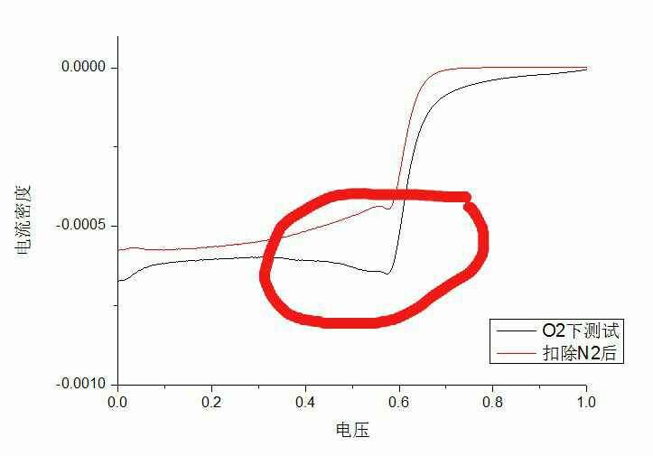 做的氧还原lsv 测试,红色的线是扣除氮气背景后的,黑色的线是氧气下测出的结果,圈出来的那一部分为什么差别那么大,求大家给解释一下,是测试过程中哪里出现的问题呢? 发自小木虫Android客户端 |