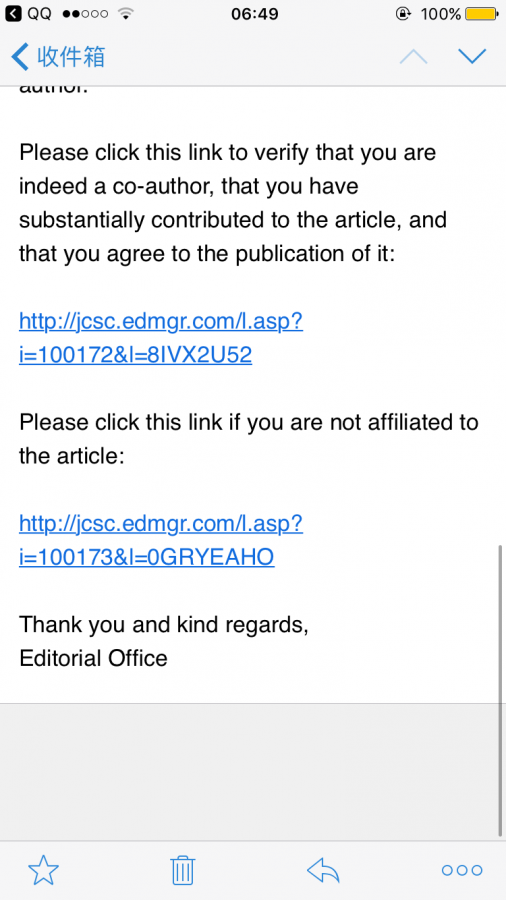 已经有另外一个作者的邮箱没收到,所以发了邮件给编辑了。我突然想到自己点了确认又点了不是共同作者的链接。如果我现在不给编辑发邮件,有没有别的办法确认我没被删,或者等接收的时候再确认可以吗? 发自小木虫IOS客户端 |